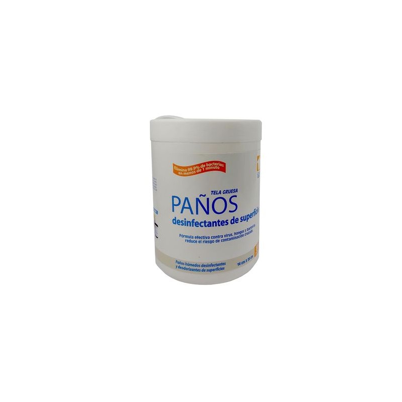 Paños húmedos desechables para limpieza y desinfección de superficies, impregnados en una solución a base de alcohol etílico 96° y cloruro de benzalconio. Tela gruesaEliminan eficazmente el 99.9% de bacterias, virus y hongos presentes en superficies ambientales no críticas como, pisos, muebles, paredes, equipo médico no crítico, camillas,etc, en menos de un minuto.Bote jumbo con 160 piezas y bote mediano con 35 piezas.