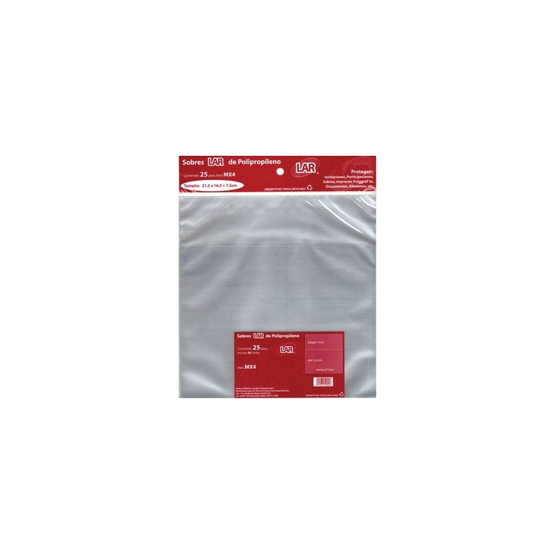 SOBRE TRANS 21 5X16 5 LAR 25P. SOBRE DE POLIPROPILENO TRANSPARENTE IDEAL PARA INVITACIONES Y APLICACIONES SOCIALES, INCLUTE ETIQUETAS ADHESIVAS.Calidad de productos y entrega OfficeMax. Nuestros productos están garantizados y estamos comprometidos con la Satisfacción Total de nuestros clientes. Tenemos entrega en toda la República.Todos nuestros productos van asegurados al 100%. La garantía es contra defectos de fabricación. No incluye daños por producto mojado, maltratado o golpeado.