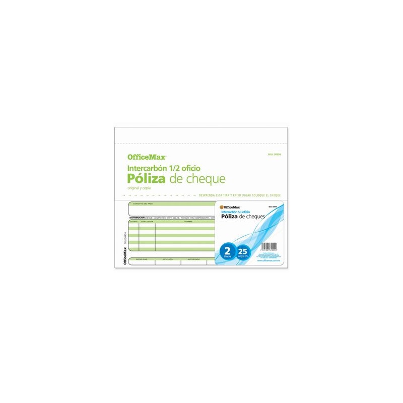 PÓLIZA CHEQUE INTERCARBON 1/2OFICIO 50JGS OMX.PAPEL BOND. PARA LAS FUNCIONES CONTABLES Y ADMINISTRATIVAS. EXCELENTE CALIDAD.Calidad de productos y entrega OfficeMax. Nuestros productos están garantizados y estamos comprometidos con la Satisfacción Total de nuestros clientes. Tenemos entrega en toda la República.Todos nuestros productos van asegurados al 100%. La garantía es contra defectos de fabricación. No incluye daños por producto mojado, maltratado o golpeado.