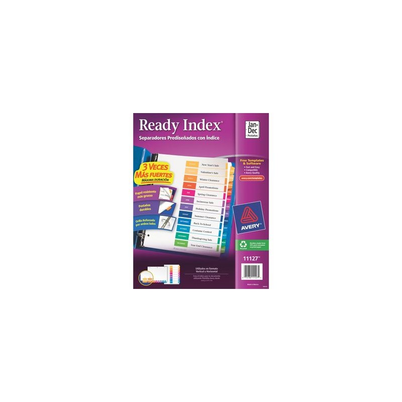 Separador prediseñado mensual de cartòn AveryCalidad de productos y entrega OfficeMax. Nuestros productos están garantizados y estamos comprometidos con la Satisfacción Total de nuestros clientes. Tenemos entrega en toda la República.Todos nuestros productos van asegurados al 100%. La garantía es contra defectos de fabricación. No incluye daños por producto mojado, maltratado o golpeado.