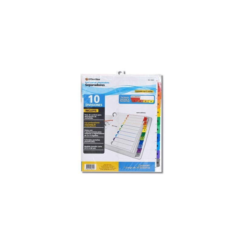 Separador 10 divisiones en colores Officemax con refuerzo